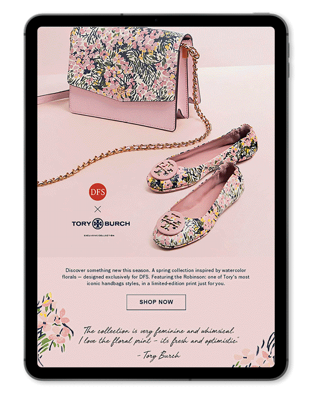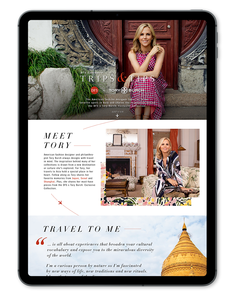 As part of the senior creative leadership team at DFS, I helped bring Tory Burch’s exclusive capsule collection to life through a multi-channel campaign targeting the global traveler. The program elevated brand visibility within the travel retail space and supported in lifting both brand sales and consumer engagement during the campaign period.